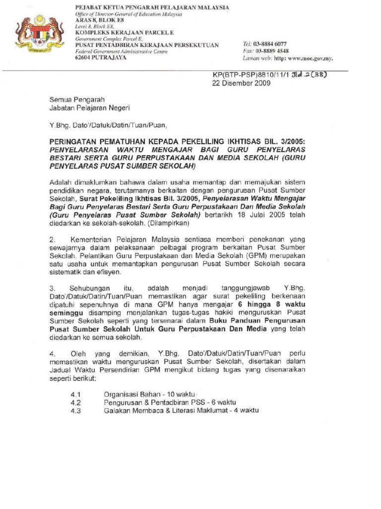 Surat Pekeliling Ikhtisas Bilangan 3 Tahun 2005 Penyelarasan Waktu Mengajar Bagi Guru Penyelaras Bestari Serta Guru Perpustakaan Dan Media Sekolah Guru Penyelaras Pusat Sumber Sekolah 1 Flip Ebook Pages 1 9 Anyflip